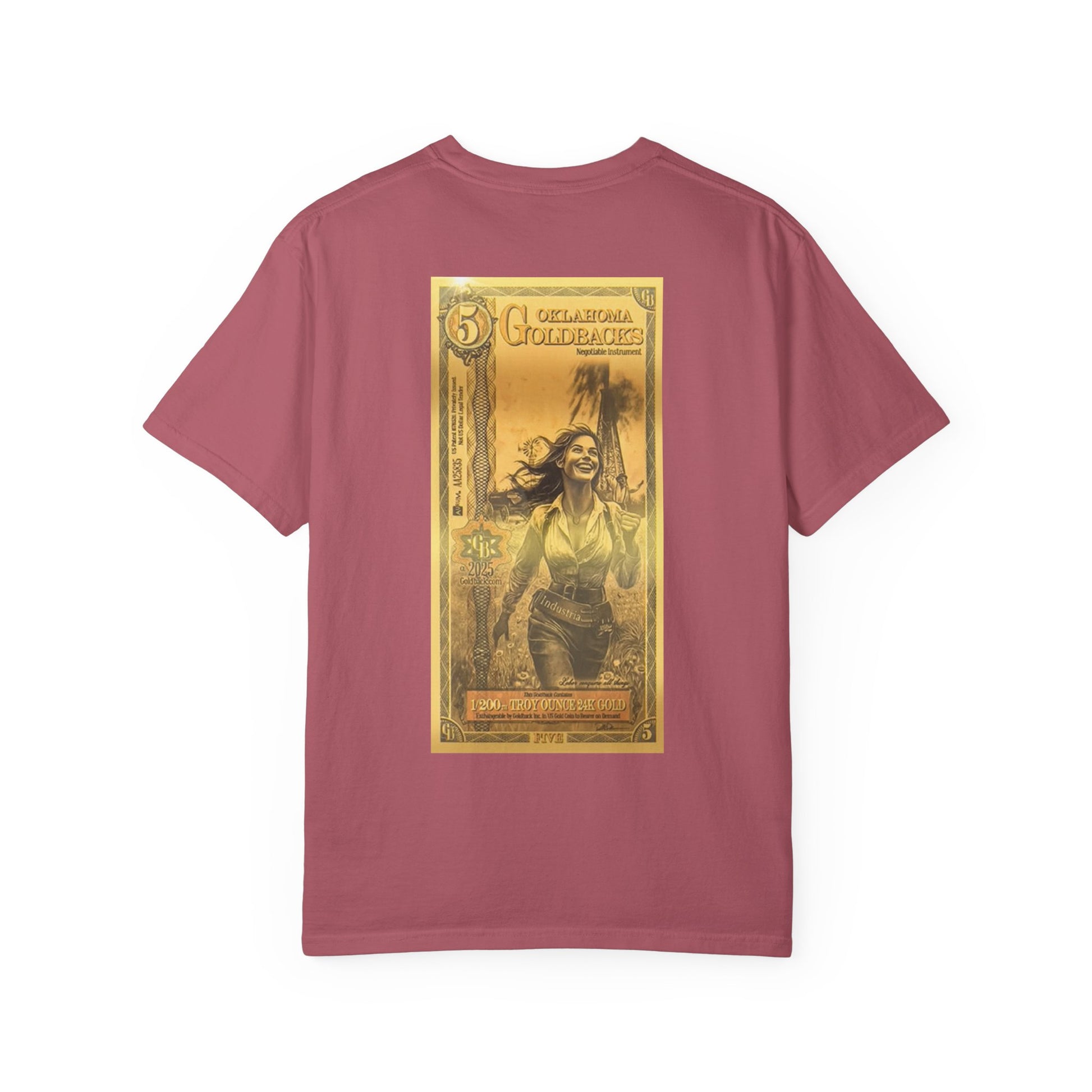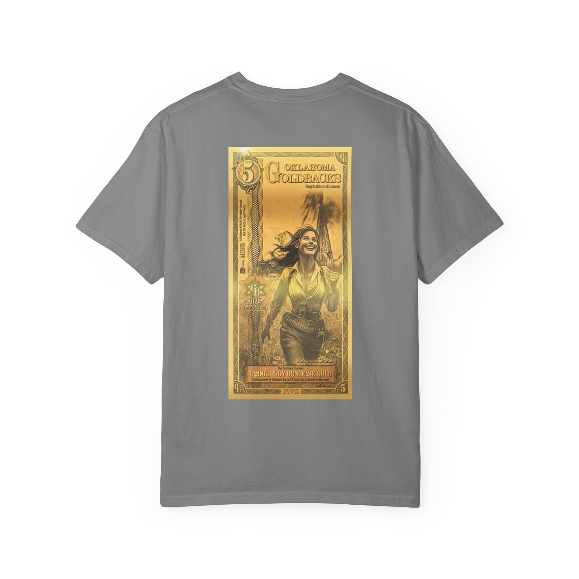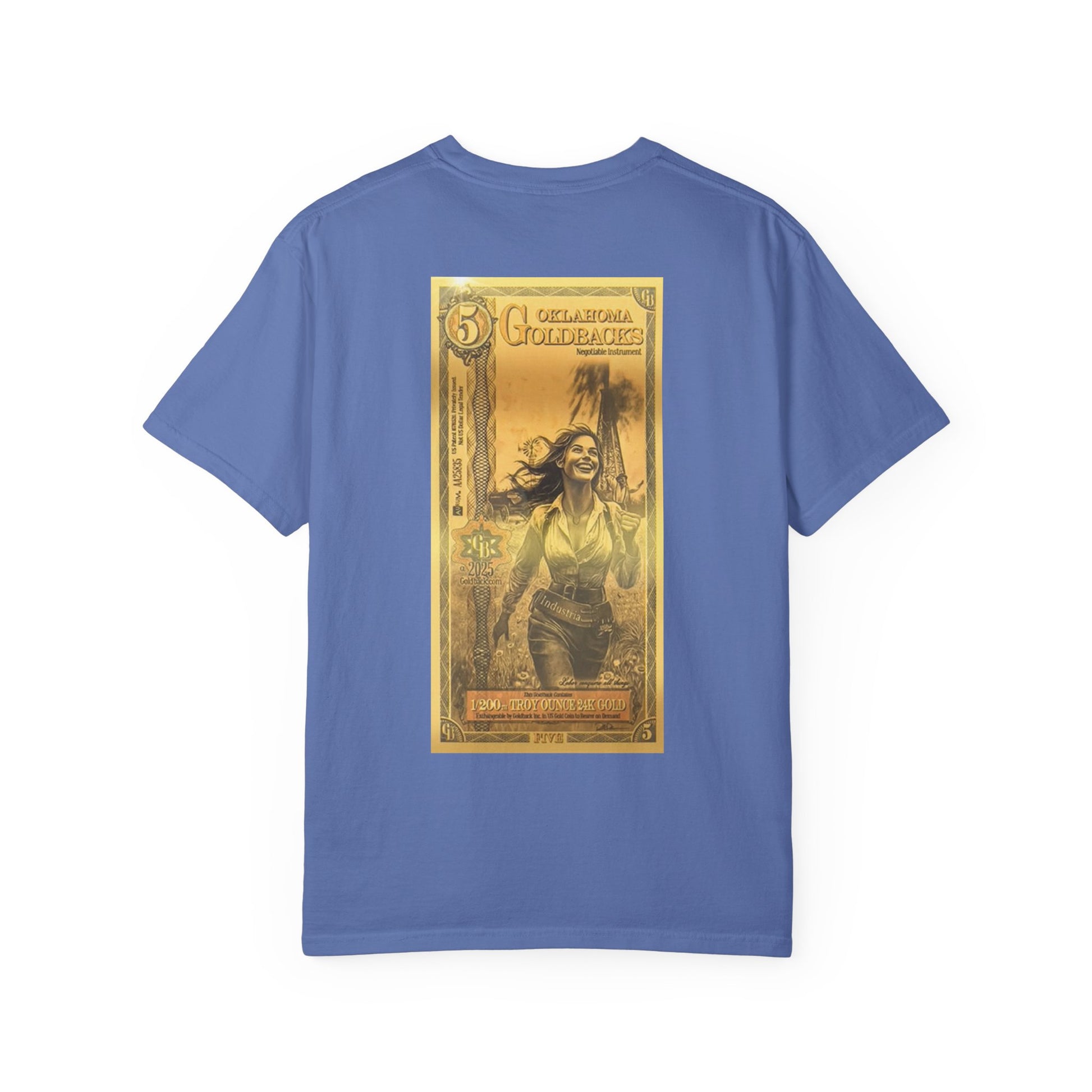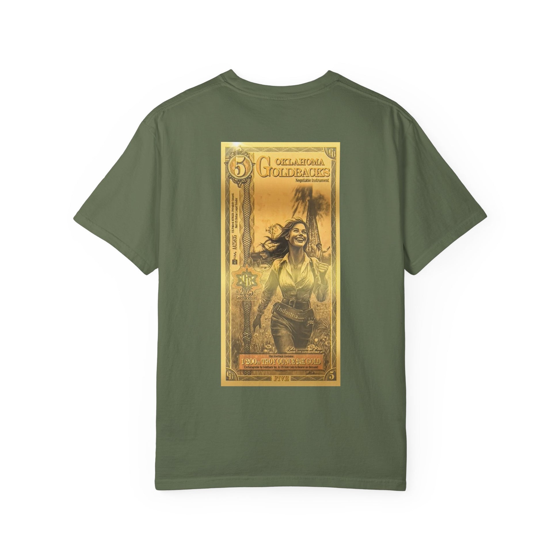 A comfortable and timeless Oklahoma Goldbacks design T-shirt perfect for fans of the 45th infantry and Lady liberty. This garment-dyed tee gives off a vintage and patriotic vibe, suitable for casual wear or accessorizing in semi-formal settings. Ideal for adults, this tee is available in sizes S to 4XL and comes in 58 color options. Perfect for patriotic holidays and history enthusiasts.