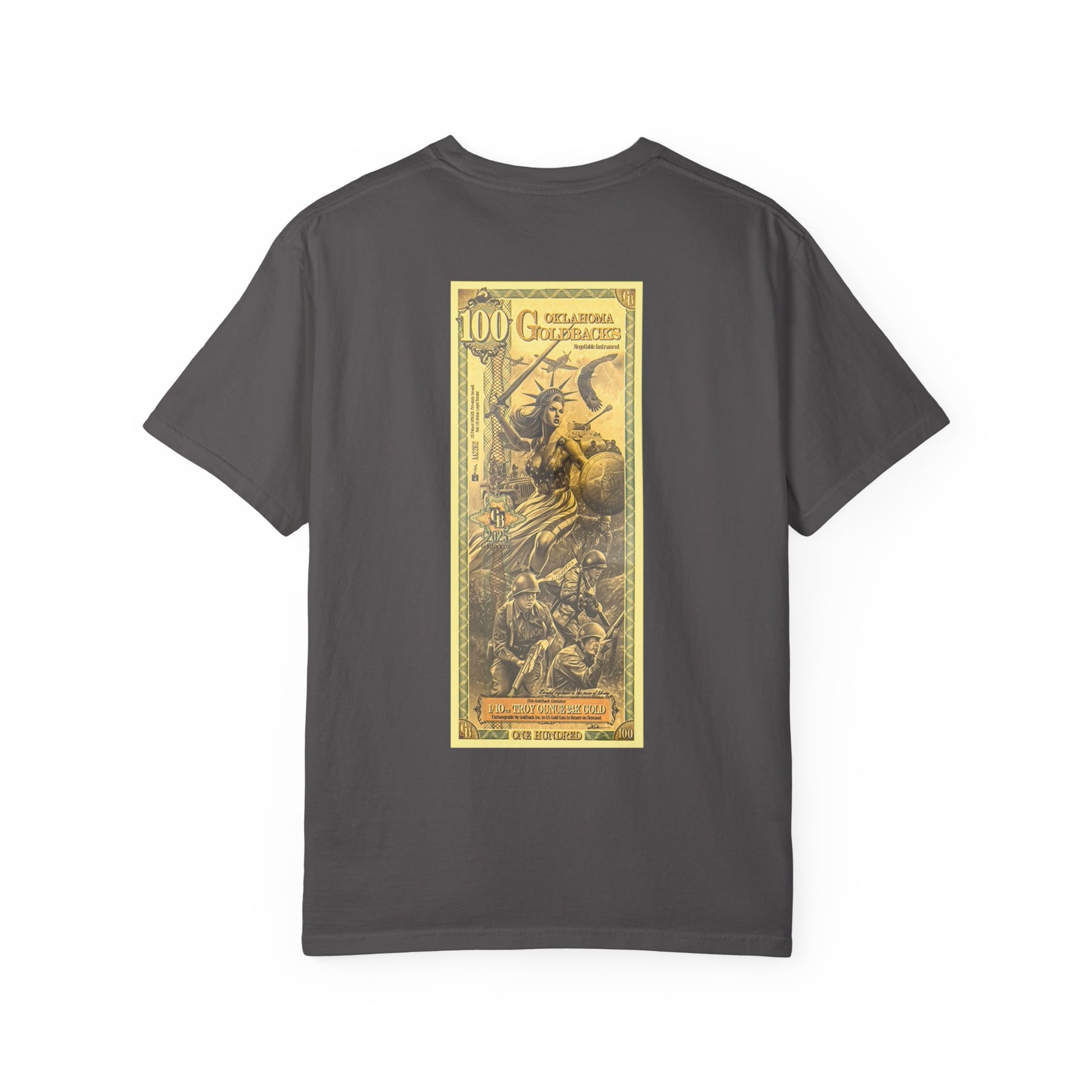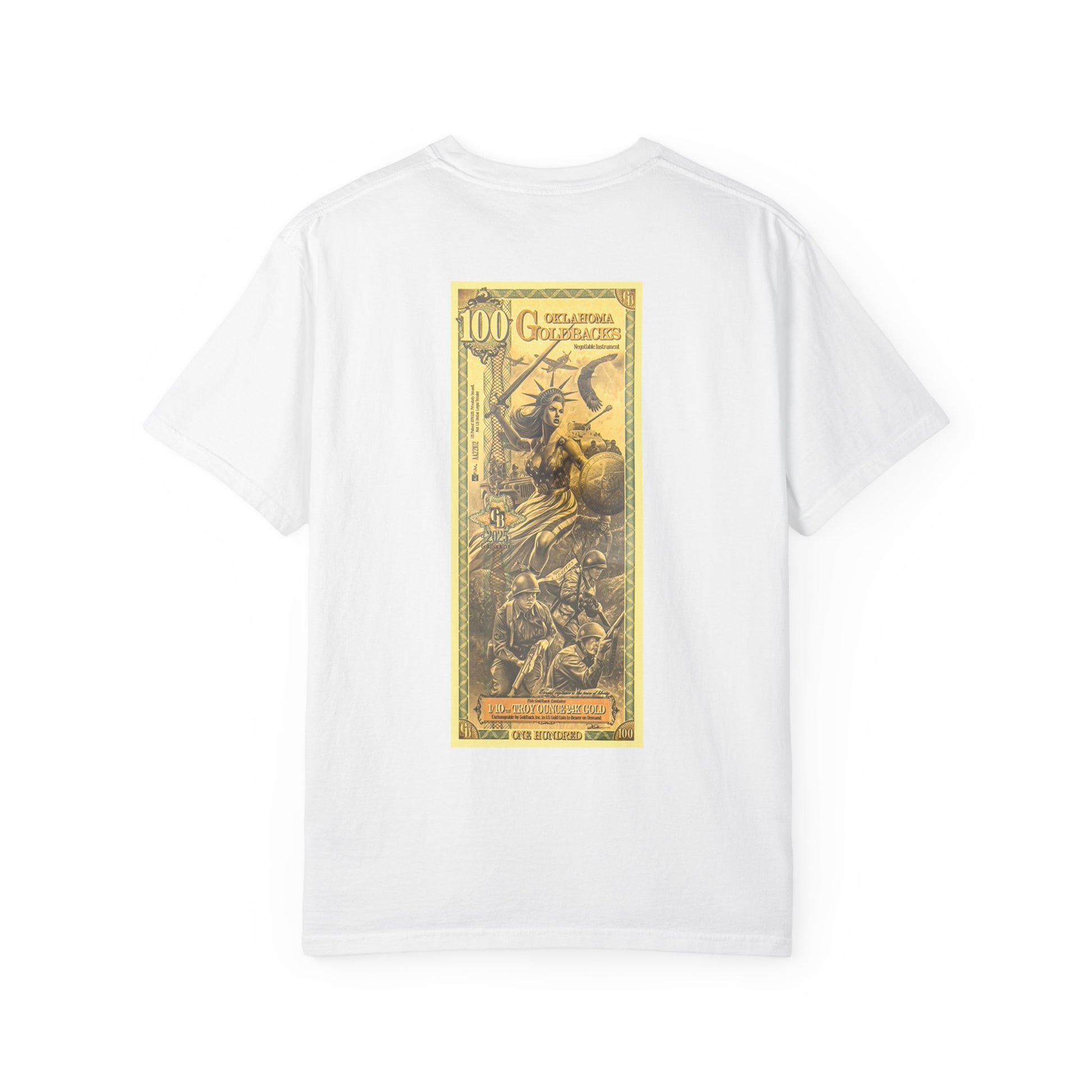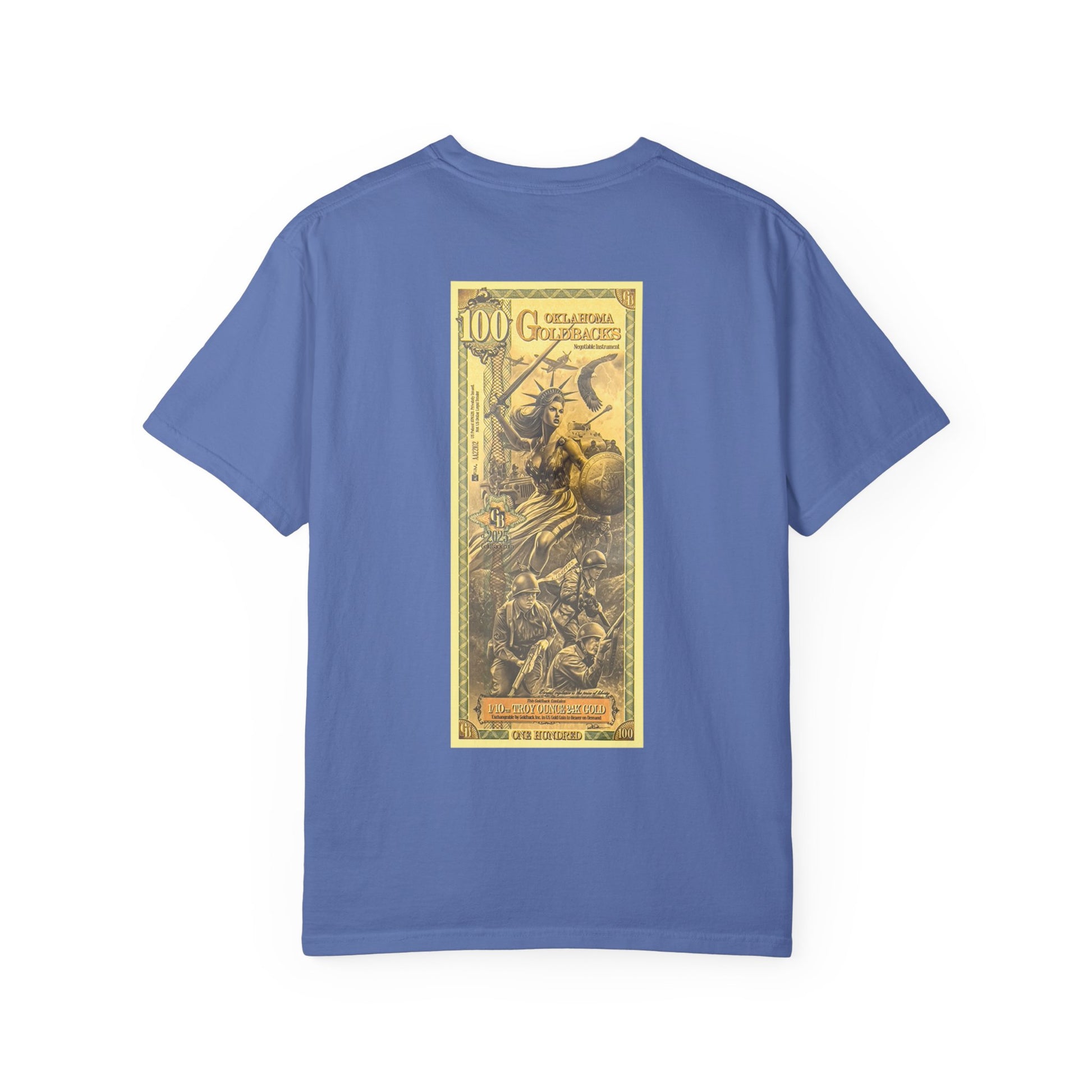 A comfortable and timeless Oklahoma Goldbacks design T-shirt perfect for fans of the 45th infantry and Lady liberty. This garment-dyed tee gives off a vintage and patriotic vibe, suitable for casual wear or accessorizing in semi-formal settings. Ideal for adults, this tee is available in sizes S to 4XL and comes in 58 color options. Perfect for patriotic holidays and history enthusiasts.